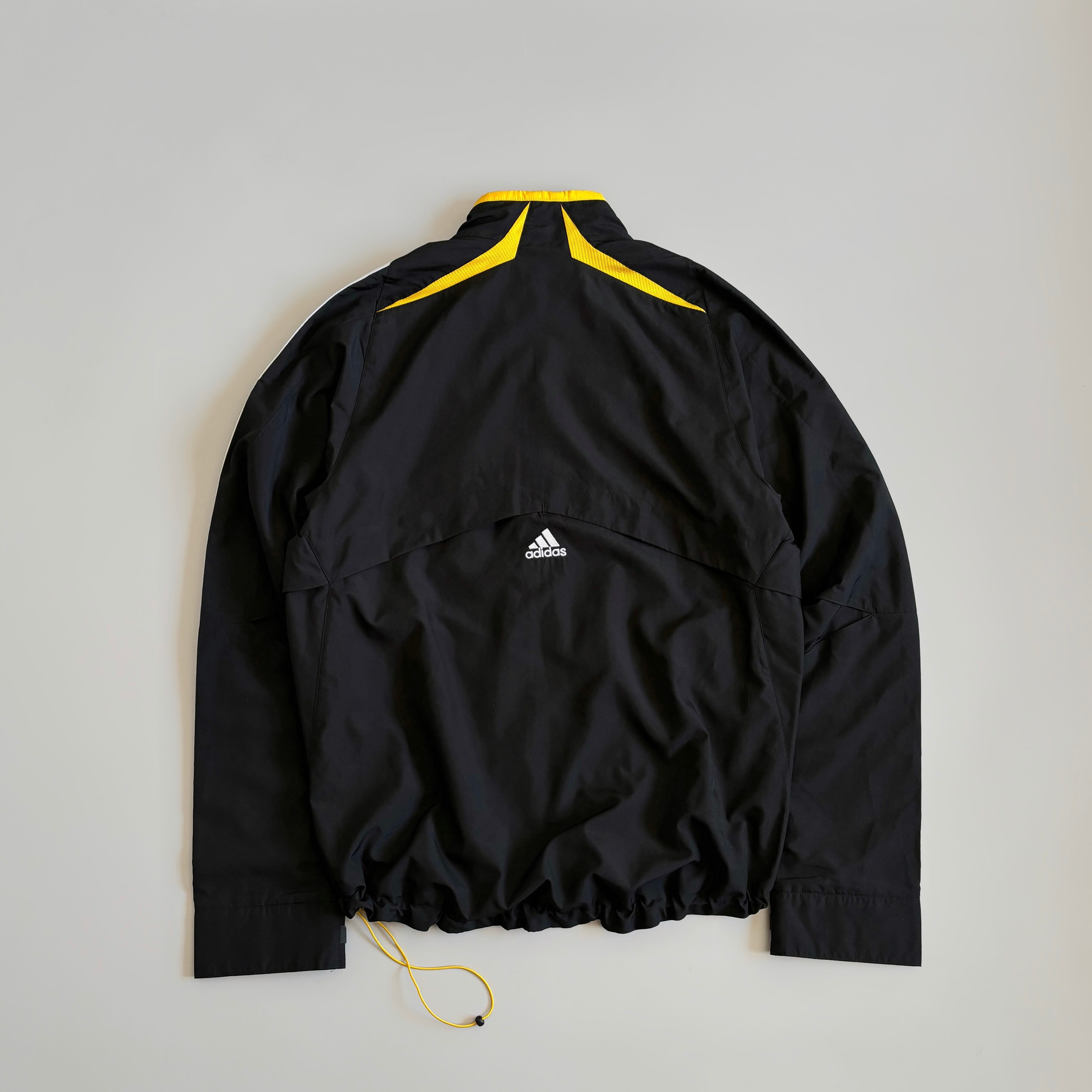ブラックボディにメッシュ切替で入るイエロー、袖に入るスリーストライプライン、胸に入るチャンピオンズリーグ刺繍、モノトーンカラーのチームエンブレム刺繍。良い配色です。