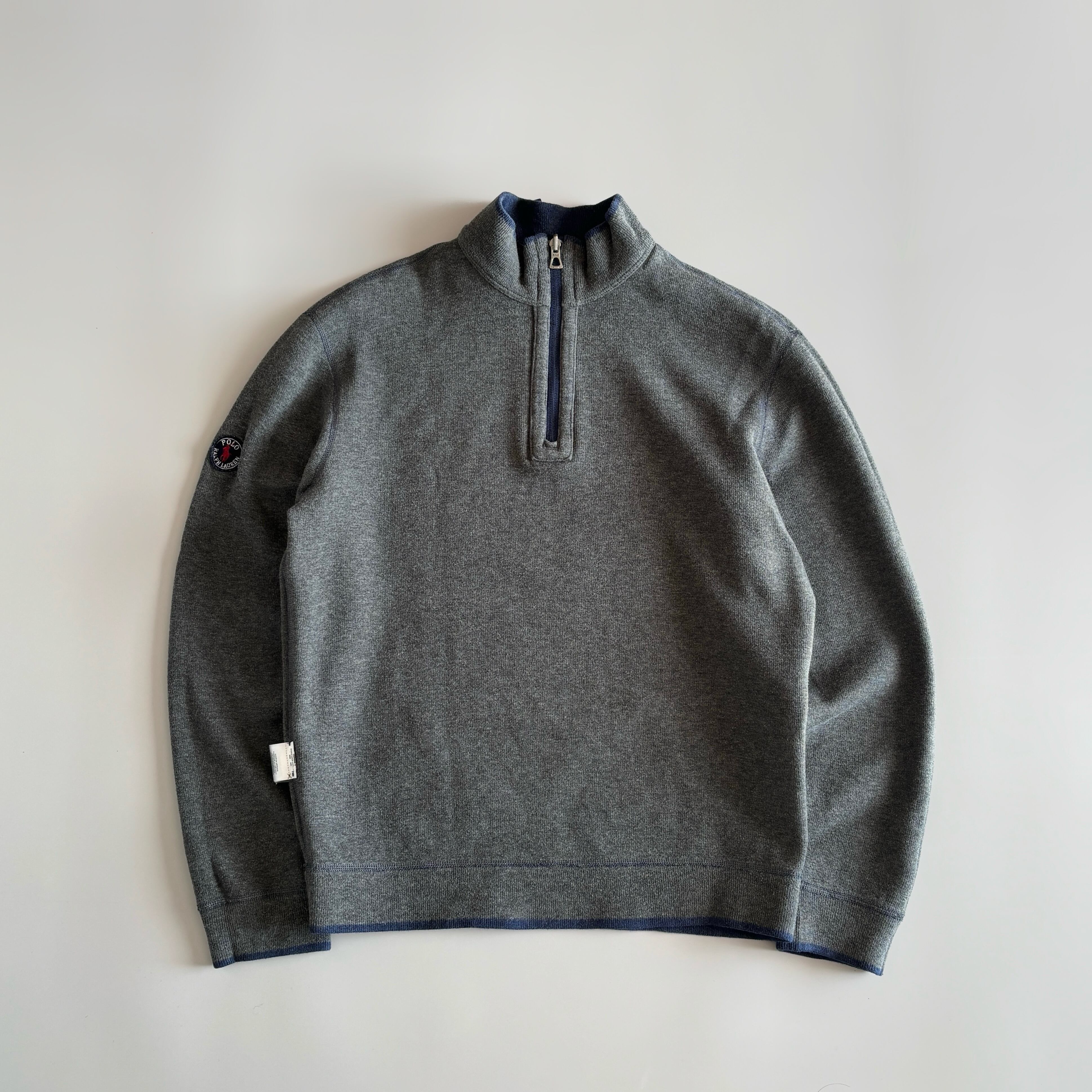フロントから見ると無地のハーフジップスウェット。高級感のあるジップも持ち手にはPOLOの刻印、袖にはフェルト生地ワッペンロゴ刺繍入り、さりげなく良いアクセント。