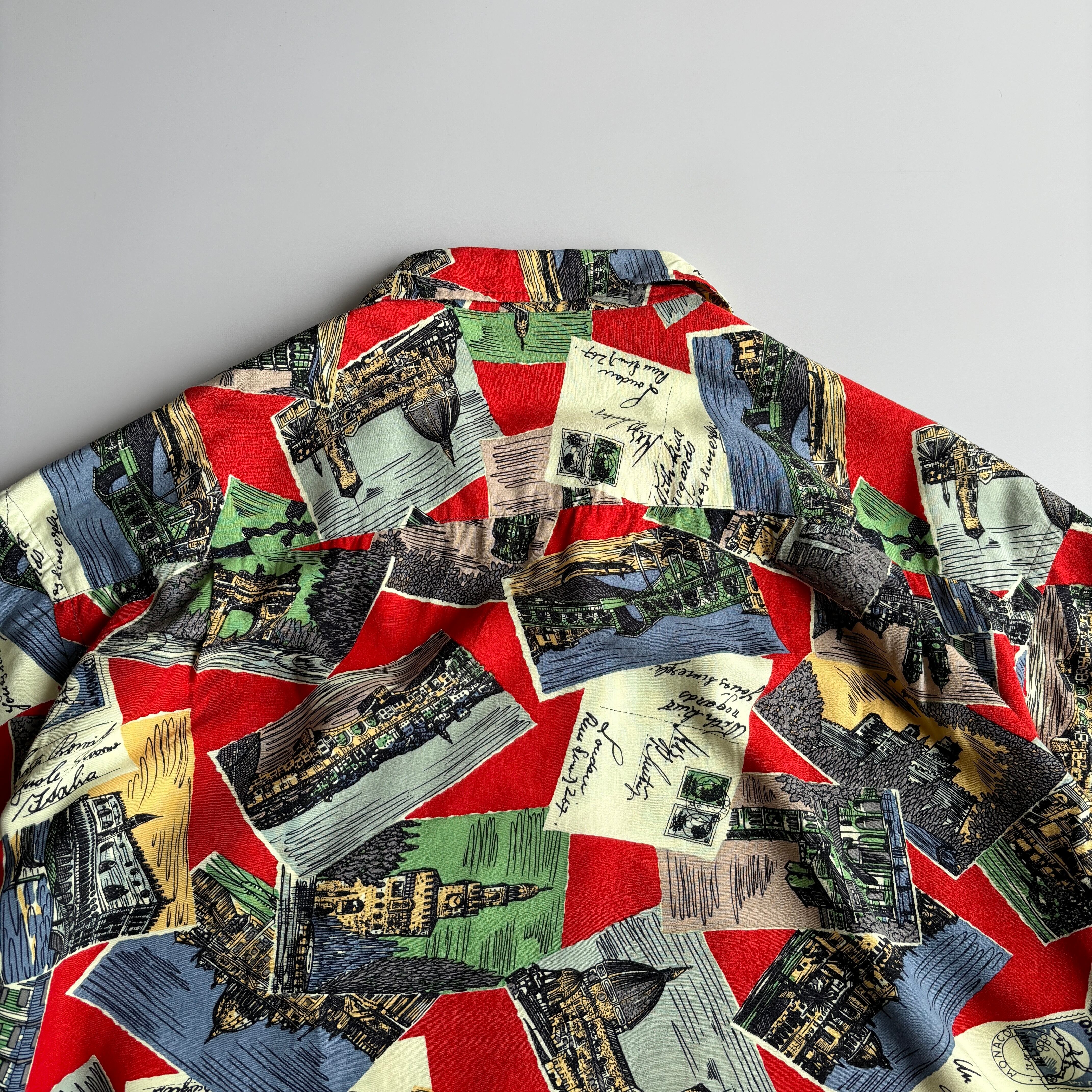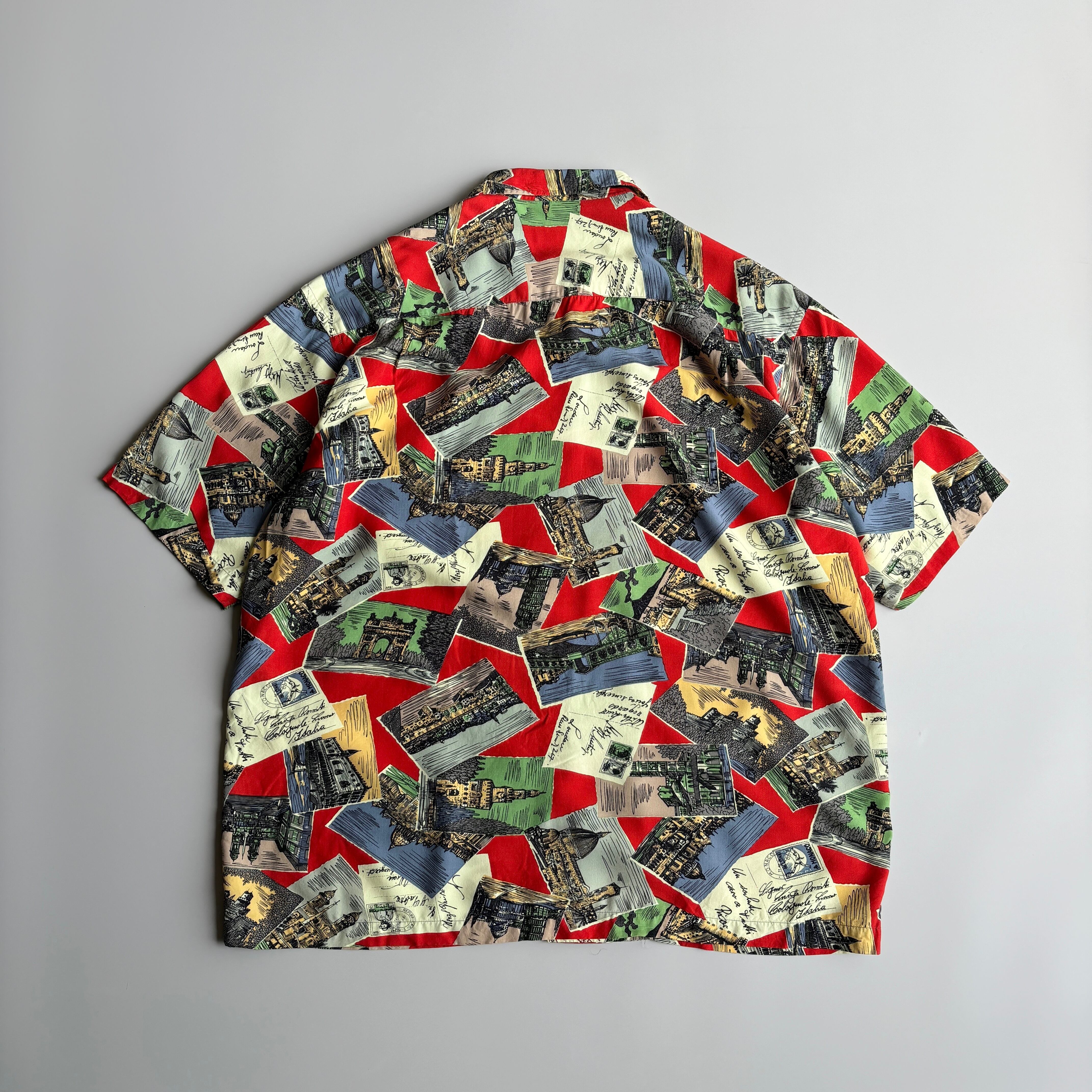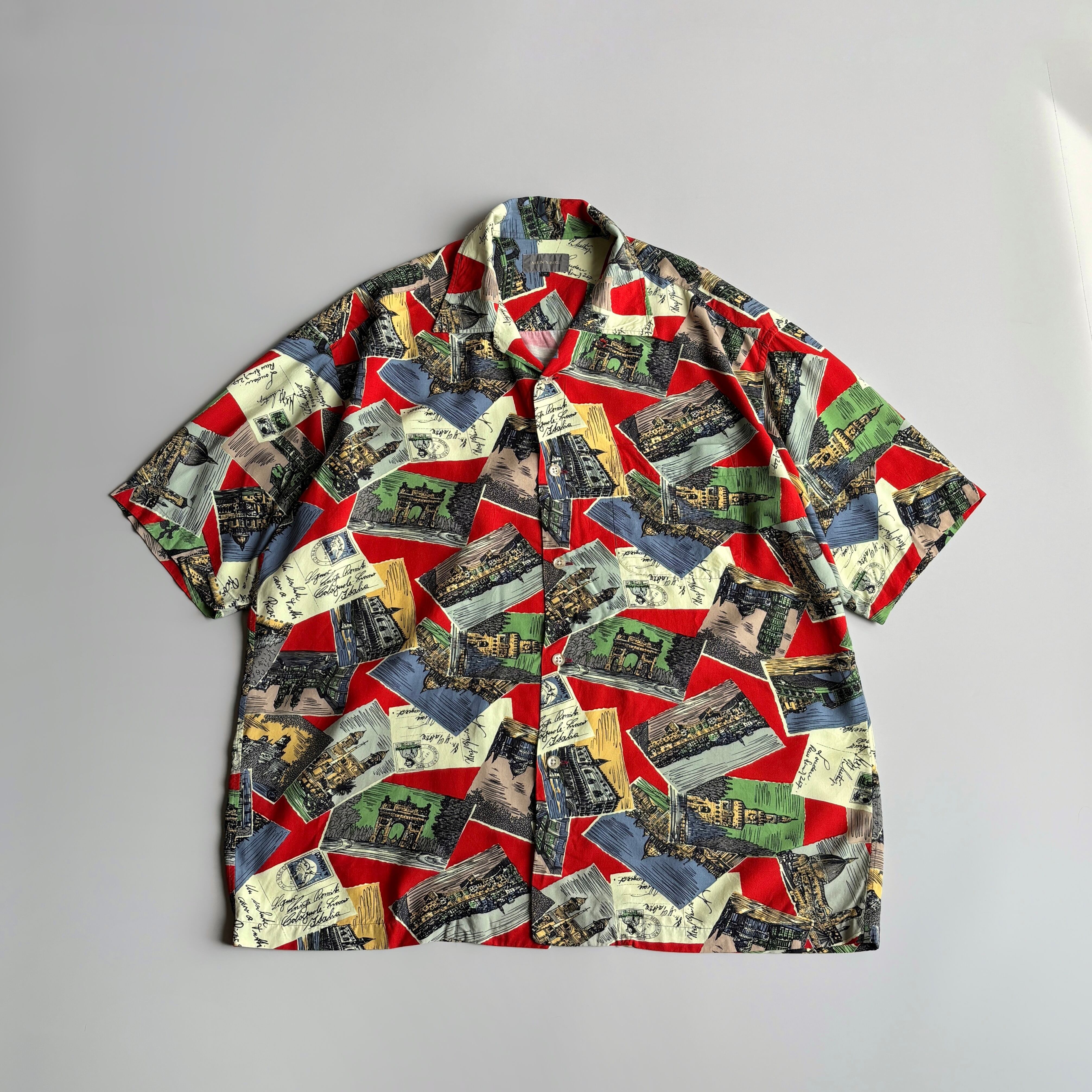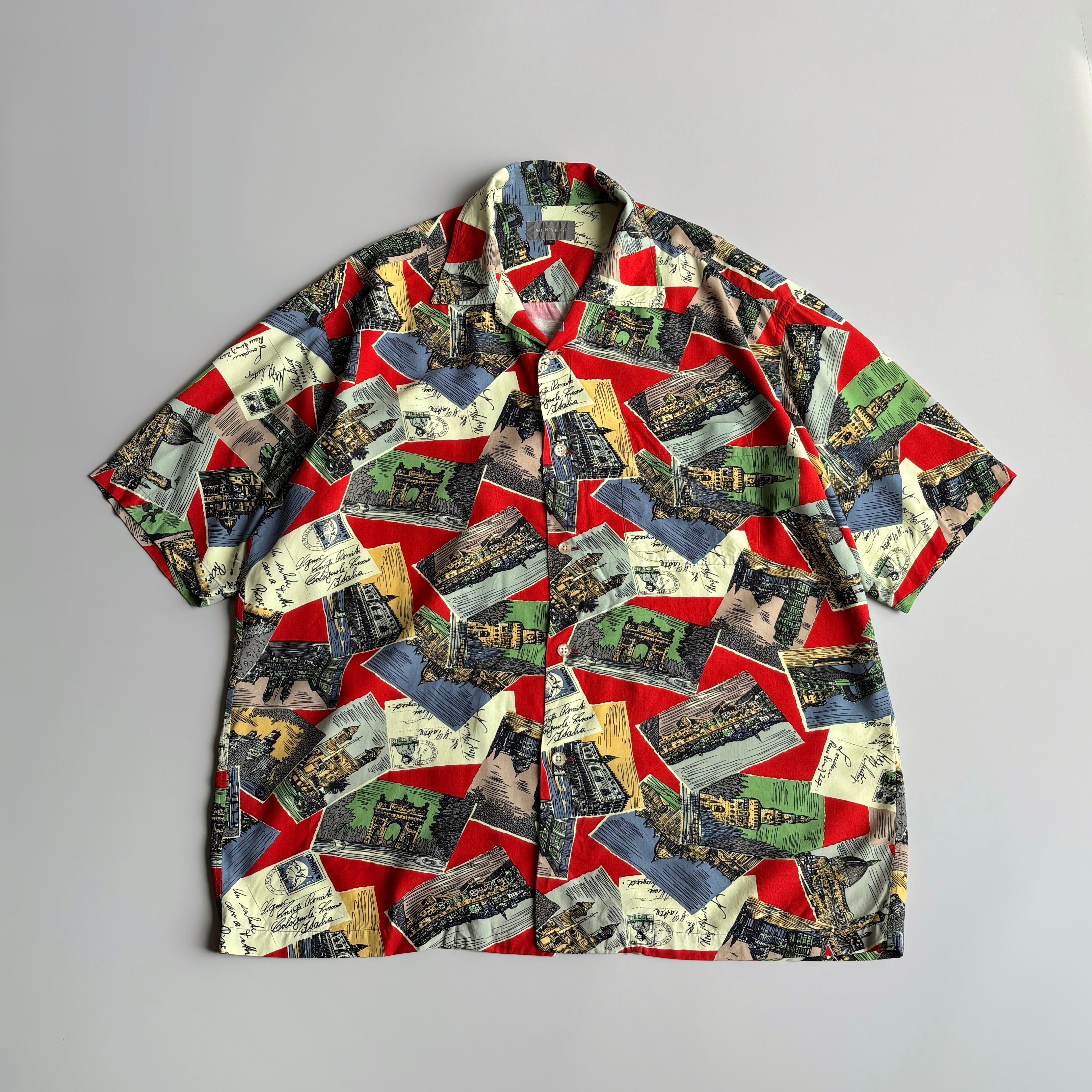 90s~ OLD BIGI 風景フォトポストカードイラスト柄 レーヨン 開襟 シャツ オープンカラー 半袖