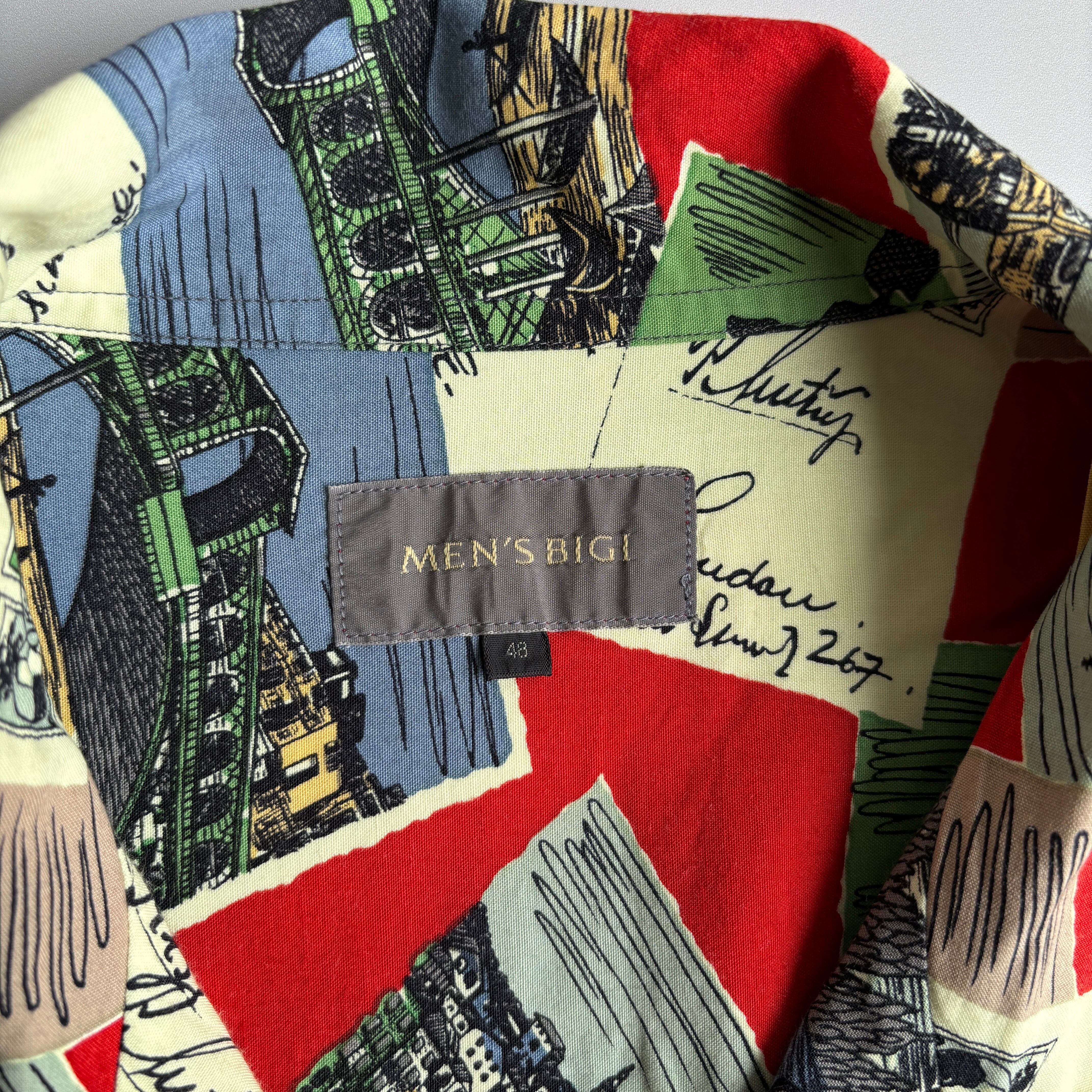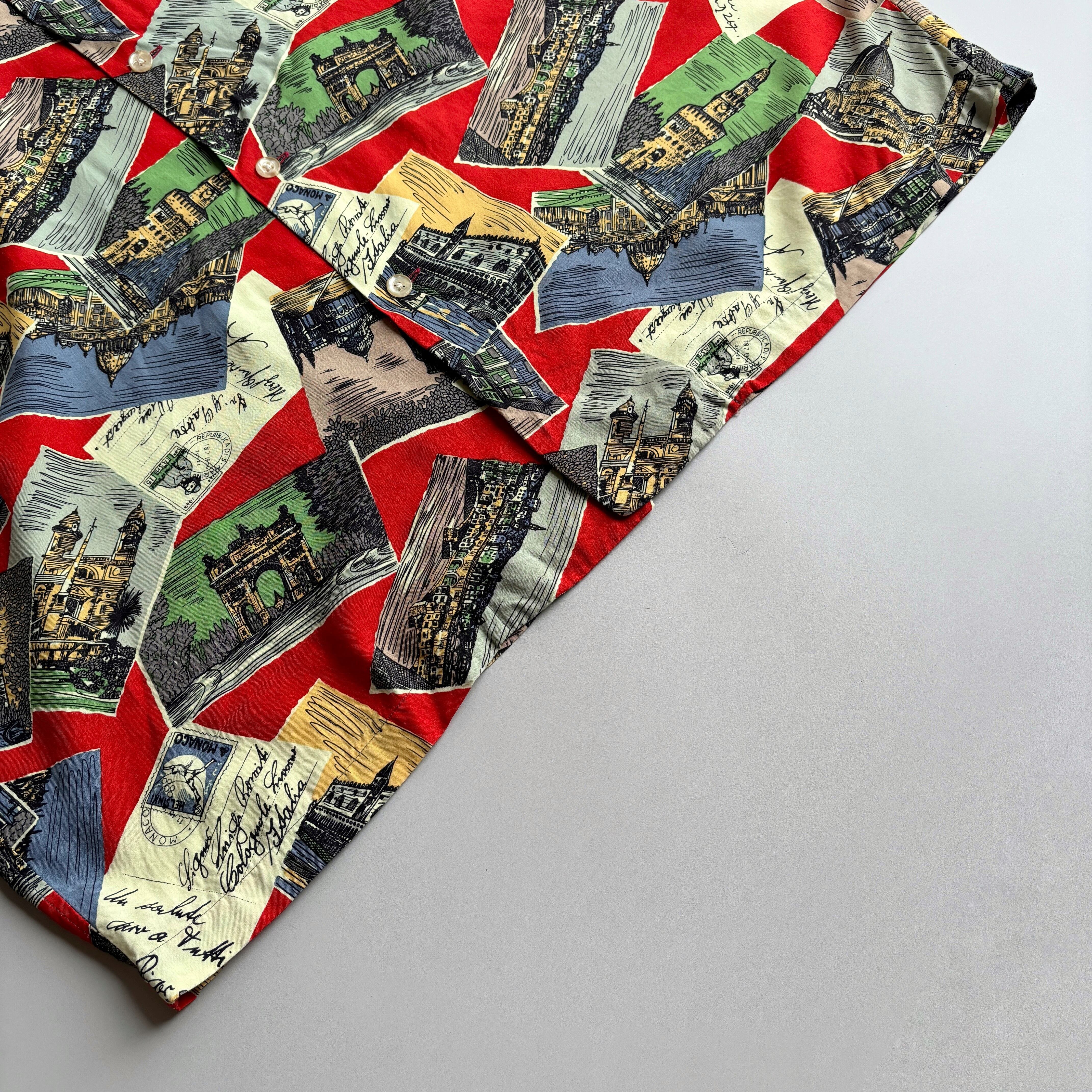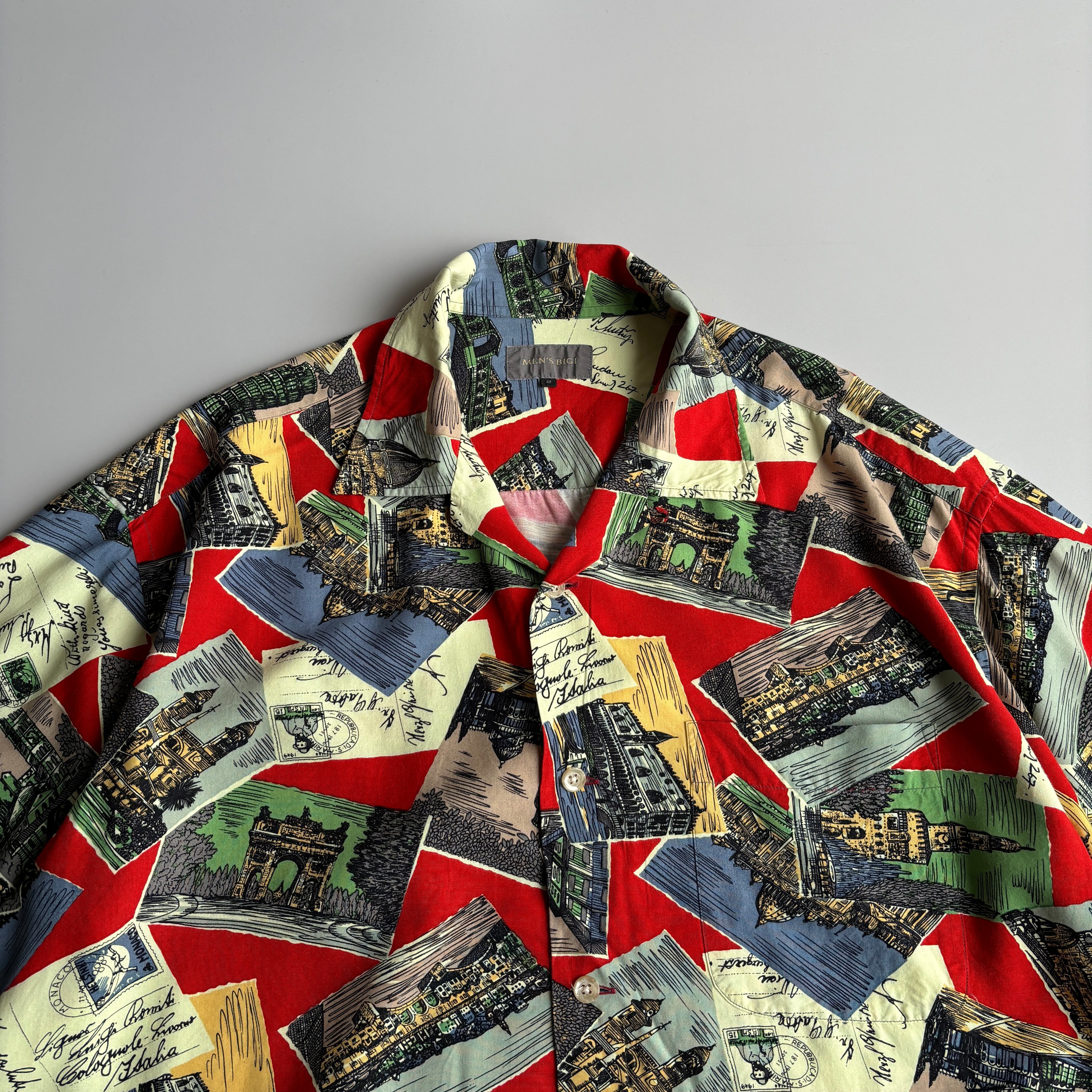 90s~ OLD BIGI 風景フォトポストカードイラスト柄 レーヨン 開襟 シャツ オープンカラー 半袖